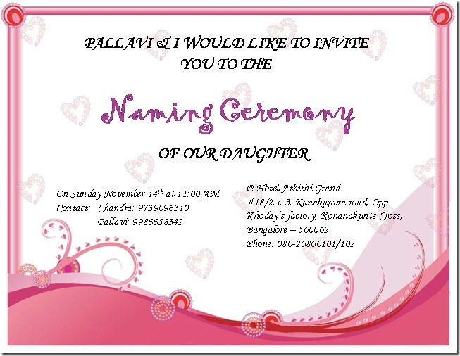 So, traditionally the 'bua' or fathers sister will whisper the chosen name into the child's ear while the child lays in the cradle. Available in english, hindi, marathi and kannada. Cards in hindi, telugu, tamil, kannada, malayalam, gujarati. This is an adorable naming ceremony invitation for baby naming and the highlighters are superb and the background goes well with the theme. Sending your online invitation and making party arrangements is as easy as digging through your email contacts.